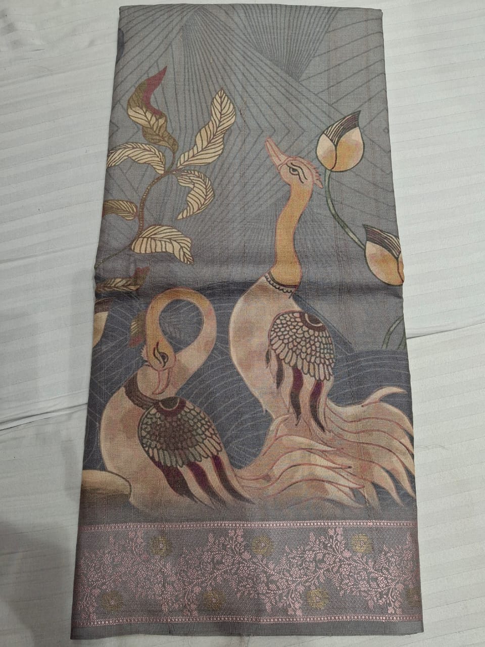Graceful pink raw silk saree adorned with elegant swan prints and a shimmering golden jari border — a perfect mix of tradition and charm.